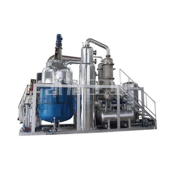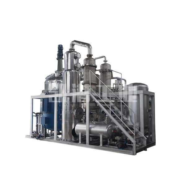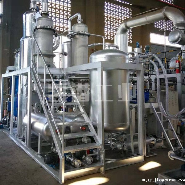 废油脱色提炼设备工艺采用国内先进的减压薄膜分子闪蒸技术,高真空条件(jue对压力10Pa)下可在较低温度下将高粘度组分的润滑油蒸馏出来,同时也降低高温裂解、聚合、设备堵塞等问题的发生。无酸渣、废酸、废水等二次污染物的产生,是一种清洁、环保、投资适当的净化工艺。