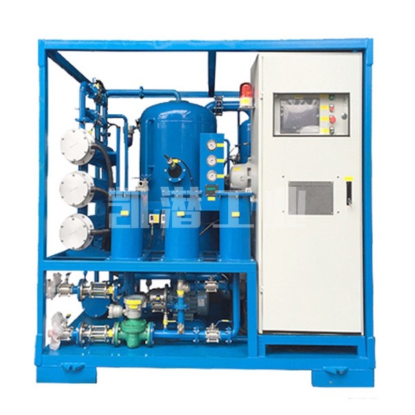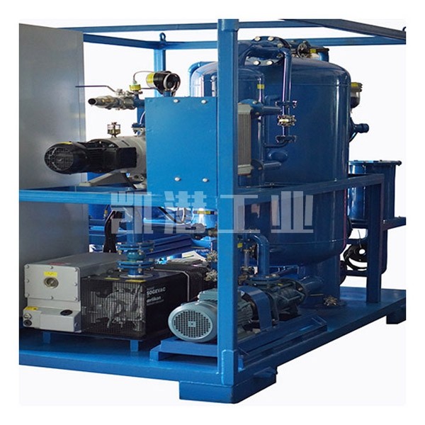 待处理的油经过一级粗滤器后进入加热器进行加热,加热后的油经过第二级过滤器到螺旋喷淋雾化系统,变为粗粒雾状下落到反应塔上进入真空分离室,水分即开始蒸发,油雾在罐内形成立体的多层面的蒸发结构,通过短时的循环,便可达到净化目的。经过除杂质、脱水、脱气、除酸的油品在油泵的作用下经过精密过滤器完成一个净油工作循环。从真空分离室中分离出来的水蒸气热空气进入冷疑器,大部分水蒸气凝结为水存入积水仓,排出机外,油中热空气经冷却后由真空泵排出。