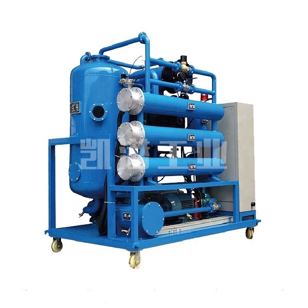 待处理的油经过一级粗滤器后进入加热器进行加热,加热后的油经过第二级过滤器到螺旋喷淋雾化系统,变为粗粒雾状下落到反应塔上进入真空分离室,水分即开始蒸发,油雾在罐内形成立体的多层面的蒸发结构,通过短时的循环,便可达到净化目的。经过除杂质、脱水、脱气、除酸的油品在油泵的作用下经过精密过滤器完成一个净油工作循环。从真空分离室中分离出来的水蒸气热空气进入冷疑器,大部分水蒸气凝结为水存入积水仓,排出机外,油中热空气经冷却后由真空泵排出。